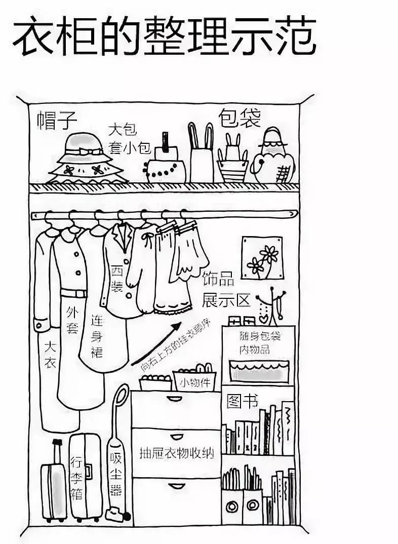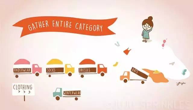 近藤麻理惠提出“一次性”整理所有东西,只保留自己真正喜欢的物品和服饰,并按照这样一个收纳顺序。