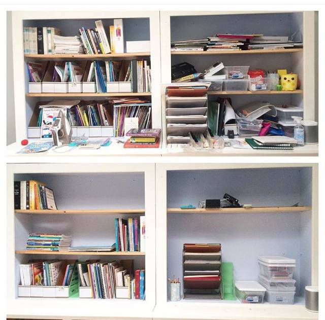 然后再把书架上的空间分割成四个部分,依次摆进去这样取书时便一目了然。