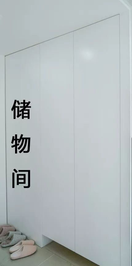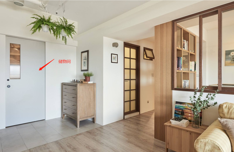 顶天立地的玄关柜依然承担鞋子、小物品的收纳任务。而储物间则负责不常用的物品的收纳,不用的电器、值得收藏的老物件、工具箱等都可以收纳于此。