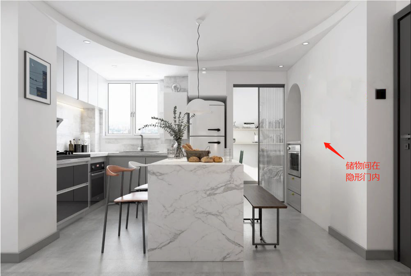 而且,储物间的面积需求并不大,一个深度80cm的柜体,就能满足,同时如需嵌入冰箱也刚刚好。