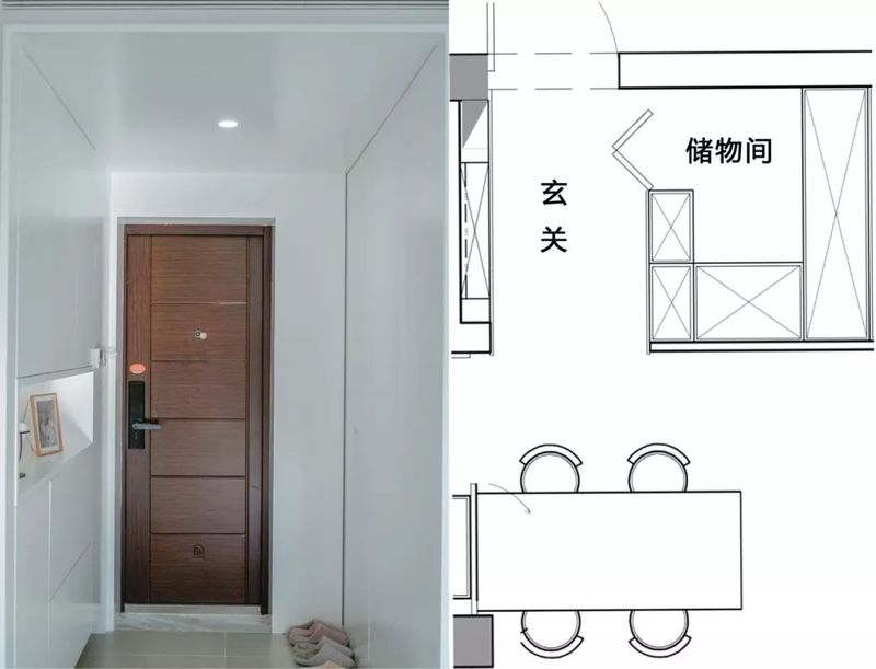 例如:该户型入户原本入户一览无遗,怎么定制玄关柜都感觉不太合适,通过在玄关左侧砌墙打造储物间,满足了全屋的收纳需求。
